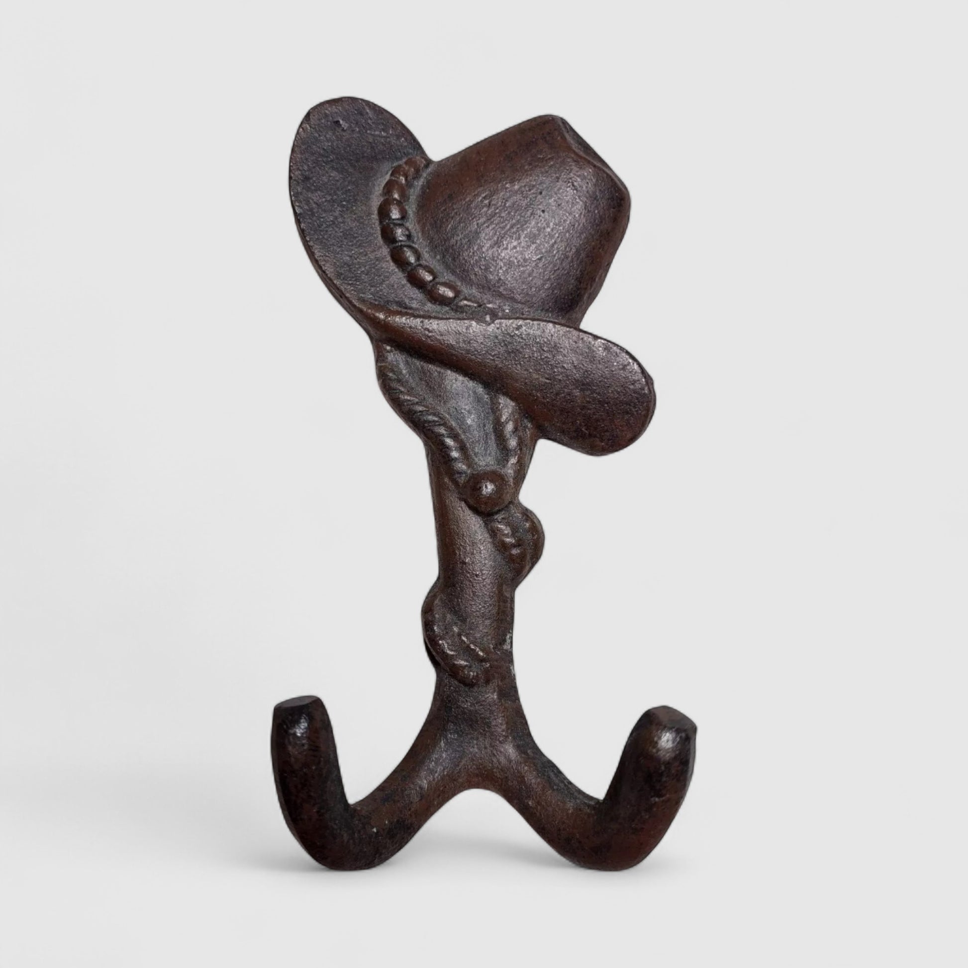 Organize hats, coats, or leashes with a Western twist using our Cast Iron Hat With Hooks. Perfect for adding a fun focal point to any entryway or mudroom, this piece features a cowboy hat shape complete with multiple hooks below. Built from solid cast iron, it's tough enough for daily use. Whether you're a Western enthusiast or just seeking a stylish hook, it delivers both durability and a playful dose of frontier flair.