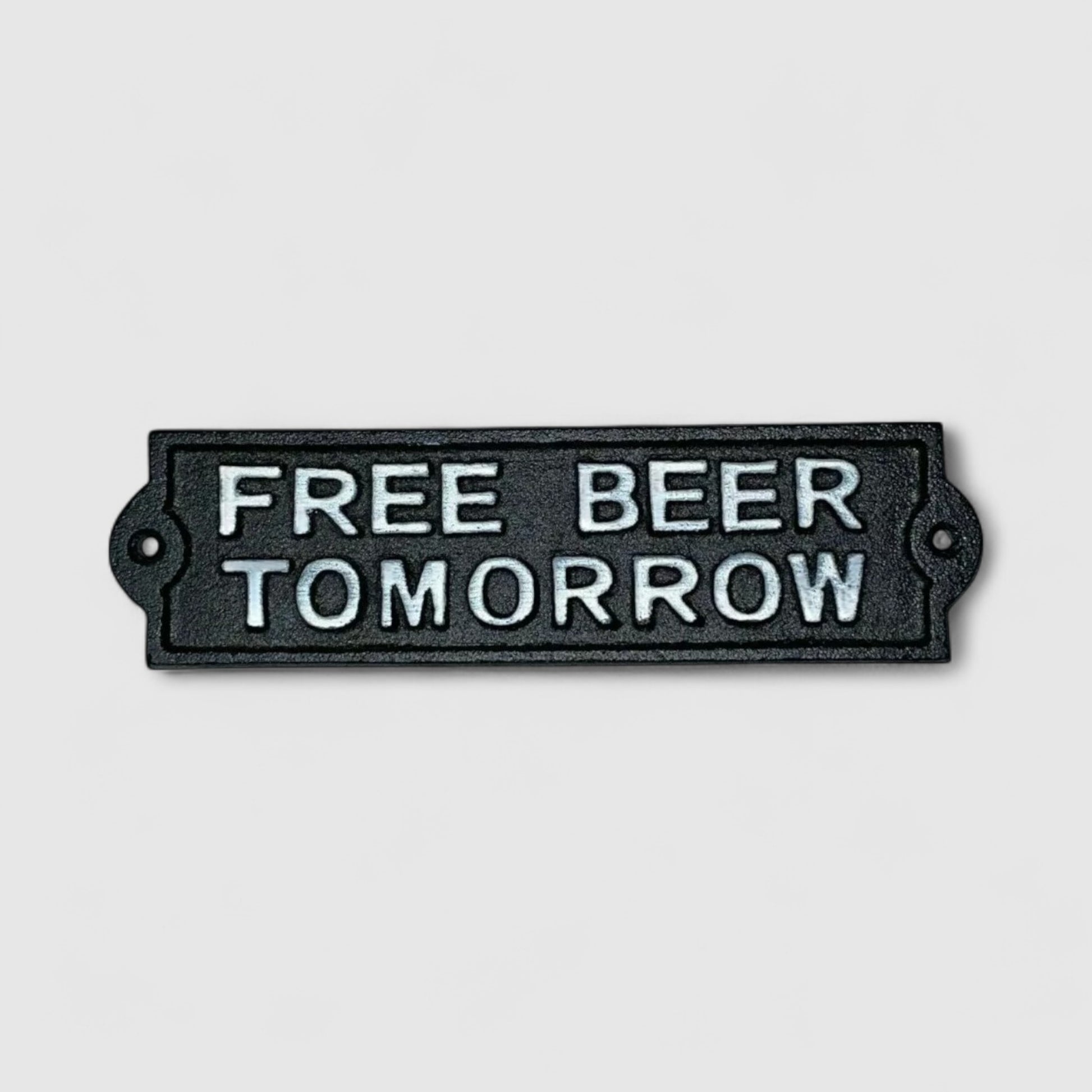 Celebrate lighthearted bar humor with our Cast Iron Plaque: Free Beer Tomorrow. Playfully teasing patrons, this sign sparks laughs each time someone reads its optimistic promise. Crafted from rugged cast iron, it endures indoor or outdoor settings, making it ideal for bars, man caves, or patio hangouts. Add a dose of tongue-in-cheek charm to your space and see how eítomorroweì never quite arrives for that free beer.
