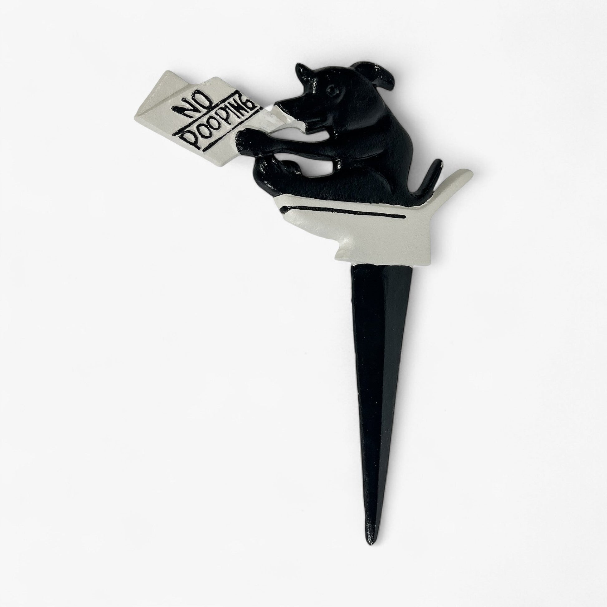 This Dog No Pooping Garden Stake Cast Iron Yard Decor delivers the message with a bit of humor while still looking clean and decorative in the yard. The design features a playful dog holding a sign that reads No Pooping, making it clear where pets should not be doing their business. The black and white finish gives it a bold, easy to read look that stands out without clashing with garden or lawn areas.
